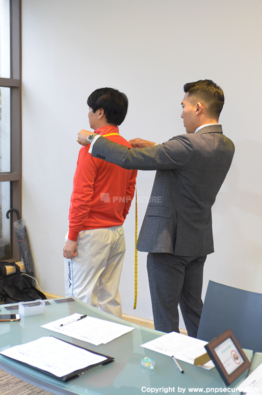 행사 시작에 앞서 기념 셔츠 제작을 위하여 현장에서 참석자의 치수를 측정하며,