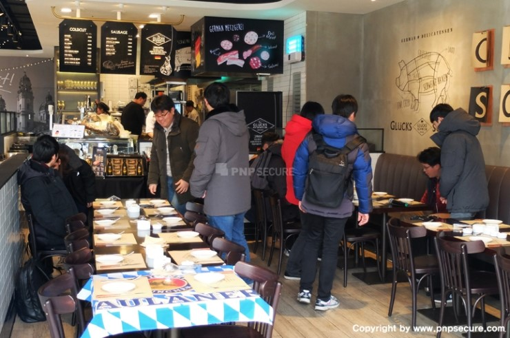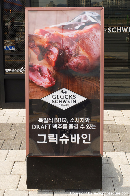 (간판에 먹음직스러운 독일식 족발 요리 '슈바이네학센' 사진이 있습니다.)