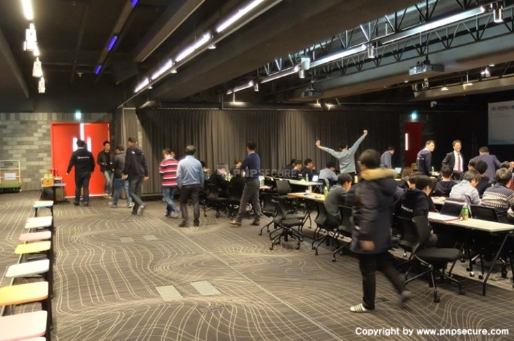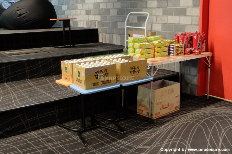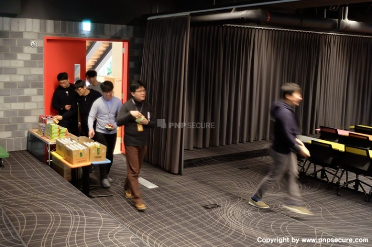 행사를 위해서 준비된 다과와 현수막, 그리고 입장하고 있는 (주)피앤피시큐어의 임직원..↓