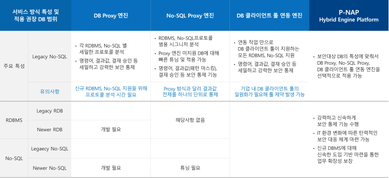 P-NAP은 피앤피시큐어의 하이브리드 기술 체제의 데이터베이스 대응 플랫폼으로, 총 3가지의 엔진을 하이브리드 형태로 결합해 제공함으로써 RDBMS, No-SQL 등 데이터베이스의 종류나 버전과 관계없이 모든 보안 대상 DB에 대해 신속하고 안정적인 보안 체계 구현이 가능합니다.