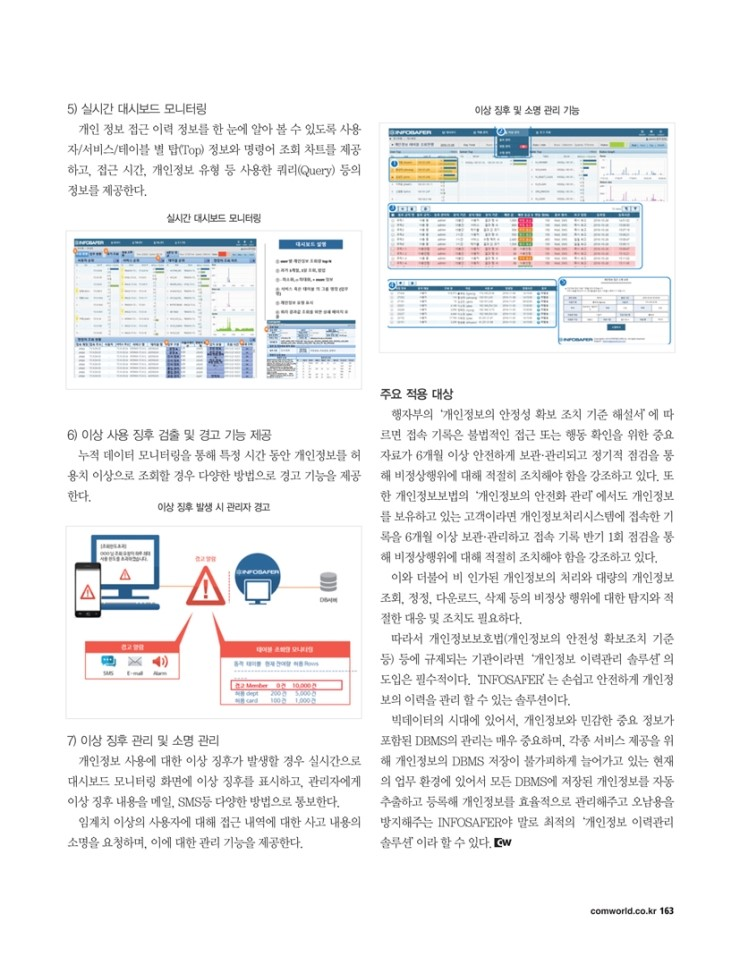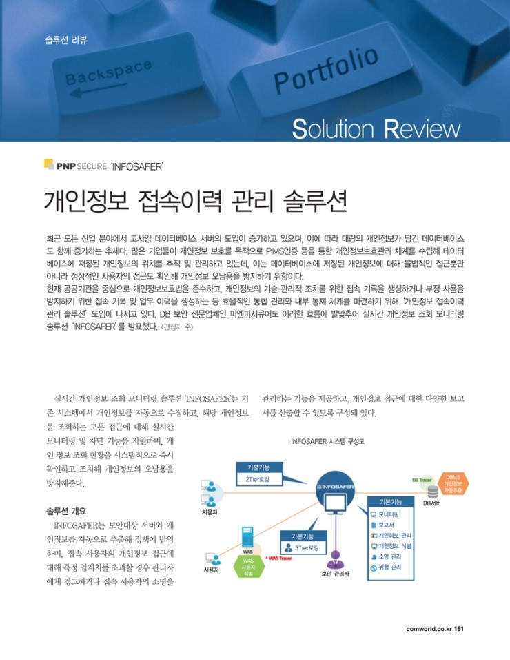 IT 전문 잡지 컴퓨터월드 2월호 '솔루션 리뷰' 코너에 (주)피앤피시큐어가 개발한 개인정보 접속이력 관리 솔루션 'INFOSAFER'가 소개되었습니다.
