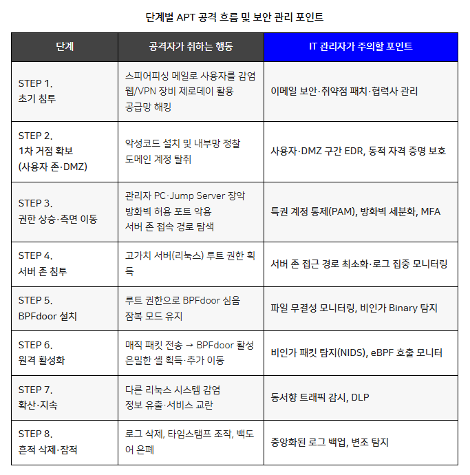 BPFDoor 같은 백도어는 사용자 PC 영역(사용자존, User Zone)을 장악한 뒤 서버존(Server Zone) 으로 레터럴 무브먼트(Lateral Movement)를 실행해 핵심 자산을 노립니다. 그렇기 때문에 방어자는 ▲접속 경로를 최소화하고 ▲권한 획득을 반복 검증하며 ▲침입을 조기에 탐지·격리하여 한 방어선이 뚫려도 다음 방어선에서 위협을 탐지·차단·지연시켜 피해를 최소화하는 다층 방어 전략으로 맞서야 합니다.