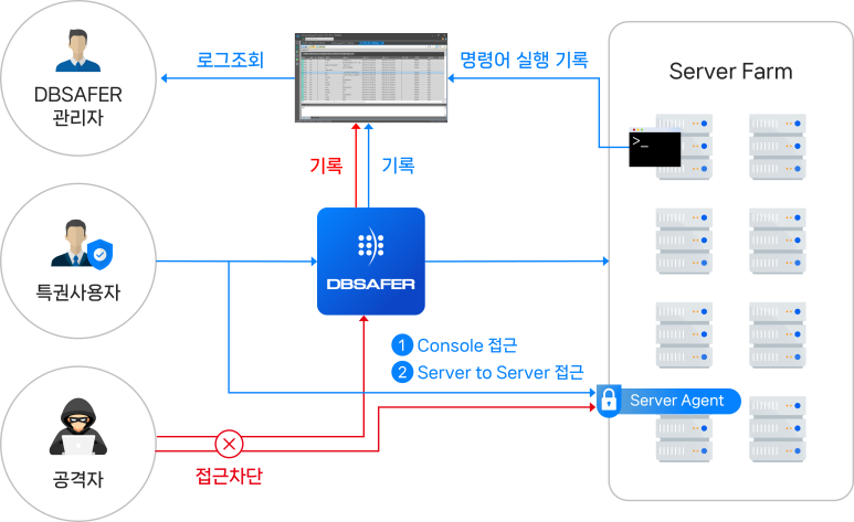 또한 프록시를 통하지 않는 Console 접속, 서버 간 접속은 ‘Server Agent’가 별도 로깅, 통제합니다.