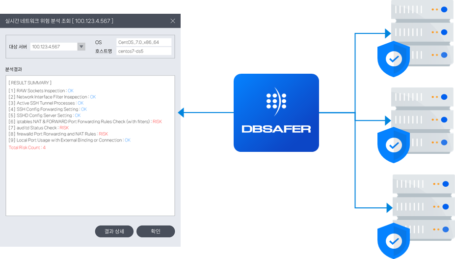 DBSAFER의 서버 자동 점검 기능은 서버의 위협을 사전에 탐색하기 위한 기능으로 각 서버 내에서 BPFDoor 및 그 변종, 그리고 보안솔루션과 방화벽을 우회할 수 있는 서버의 네트워크 설정까지 사전에 탐색할 수 있습니다.