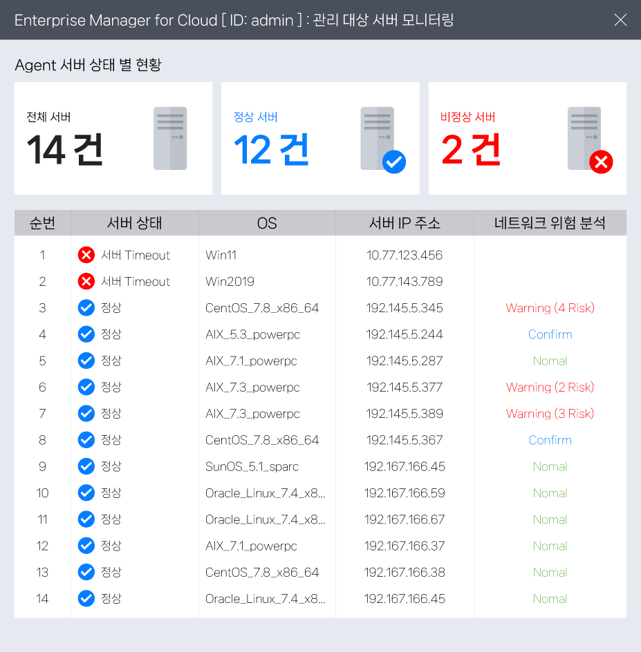 또한 보안 관리자가 중앙에서 전체 서버 상태를 한눈에 확인할 수 있도록 대쉬보드 형태로 상태 정보를 제공합니다. DBSAFER를 사용한다면 서버 자동 점검 기능을 통해 서버의 이상 상태를 주기적으로 실시간 확인할 수 있으며 이를 기반으로 관리자는 선제적인 방어 체계를 안정적으로 유지할 수 있습니다.