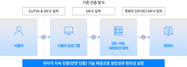 DBSAFER는 이러한 경로 차단에 특화된 보안 게이트웨이로, 제로 트러스트 원칙을 기반으로 사용자 영역에서 서버 영역으로 권한 상승과 측면 이동이 불가능하도록 패스워드리스(Passwordless) 방식의 서버 접속과 서버 접속 이후 모든 업무 행위를 명령어 단위로 인증하면서도 사용자 불편 없이 실시간 지속 인증(Continuous Authentication) 체계를 제공합니다.