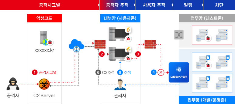 DBSAFER의 통신 정합성 분석 기능은 프로토콜 규격을 벗어난 패킷을 실시간으로 탐지하고 차단합니다. 따라서 해커가 대상 서버로 BPFDoor 활성화 신호를 보내도 DBSAFER에서 필터링되어 대상 서버에는 시그널이 전달되지 못하고, BPFDoor는 실행될 기회조차 없어지는 것입니다.