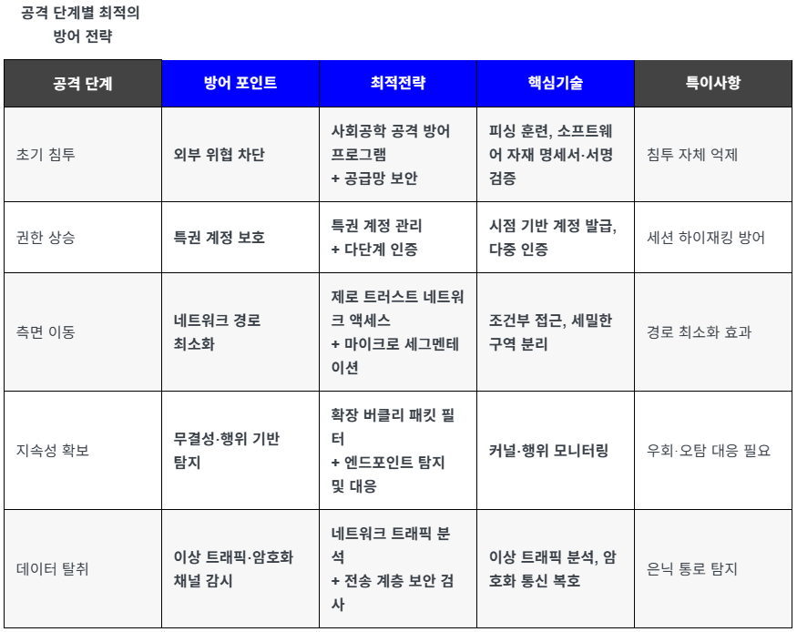 아래에서는 공격 단계별로 가장 합리적인 대응책을 해킹 전문가 시각에서 서술하고, 마지막에 한눈에 볼 수 있도록 표로 정리합니다.