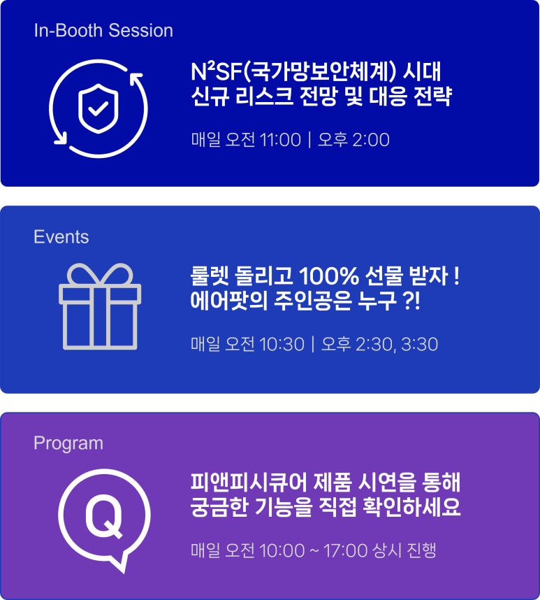 피앤피시큐어 부스 #S027에서 인부스 세션과 이벤트, 시연 등 다양한 프로그램을 운영합니다.