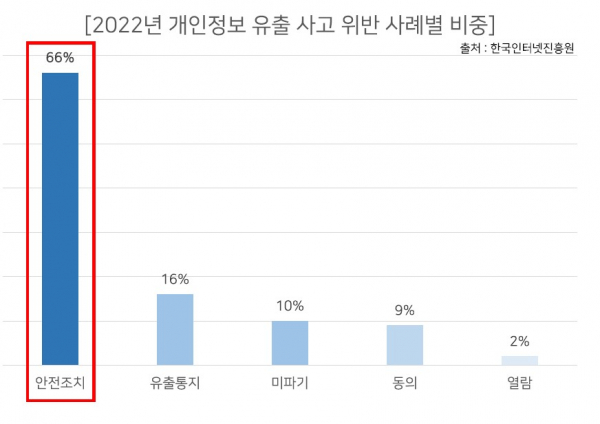 한국인터넷진흥원(KISA)이 지난해 발표한 통계에 따르면 개인정보 유출 사고의 약 66%가 안전조치 소홀로 발생했다. 이 통계에서 말하는 안전조치 범위는 다음과 같다.