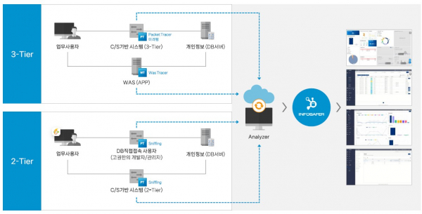 기업에서 개인정보 처리자가 DB에 저장된 개인정보 처리시스템에 접속하는 경로는 웹/WAS 서버를 통한 접속, C/S를 통한 접속(3-Tier), DB 직접 접속(2-Tier)하는 방식이 있으며, 법률에서는 이 3가지 모두에 대한 접속 기록을 남겨야 한다고 명시돼 있다.