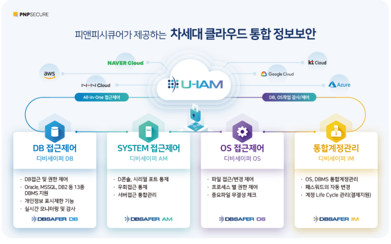 이는 국내 최대 규모의 사업으로 온프레미스와 클라우드 환경을 통합해 시스템접근제어와 DB접근제어 보안기능을 피앤피시큐어의 U-IAM 통합 솔루션(DBSAFER)으로 전체 표준화해 제공했다.