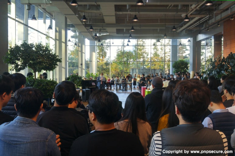 1층 로비에는 타 계열사를 비롯한 다양한 임직원들이 모여 멋진 음악을 감상하고 있었습니다.