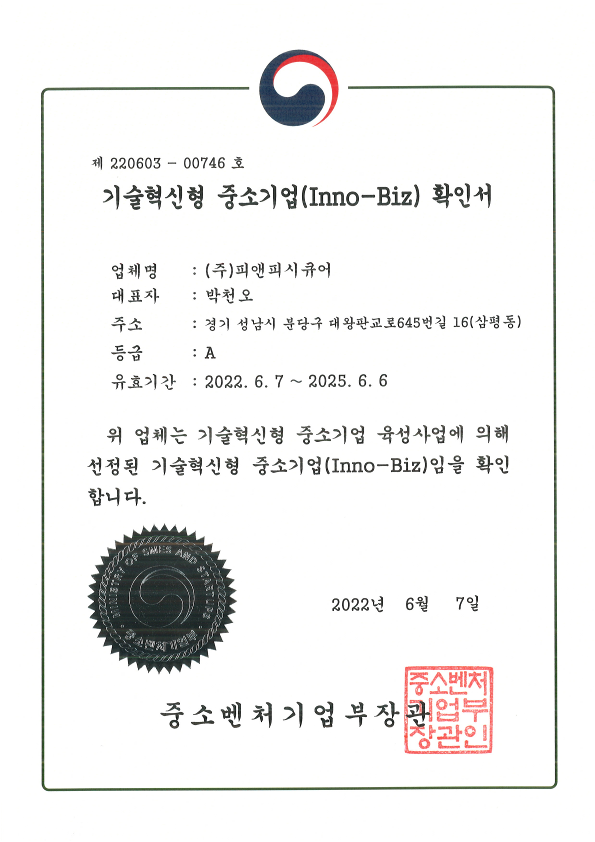 INFO [인증] 기술혁신형 중소기업(Inno-Biz) PNPSECURE 17 6월 2022 • 1 min read 중소벤처기업부가 주관하는 기술혁신형 중소기업 인증제도 '이노비즈(Inno-Biz)'피앤피시큐어는 6월 차별화된 기술력을 기반으로 경쟁 우위를 확보한 기술혁신형 중소기업으로 인정받아'이노비즈(Inno-Biz)' 인증을 취득 했습니다!기술혁신형 중소기업(Inno-Biz) 확인서등급 : A인증일자 : 2022년 6월 7일인증기관 : 고용노동부