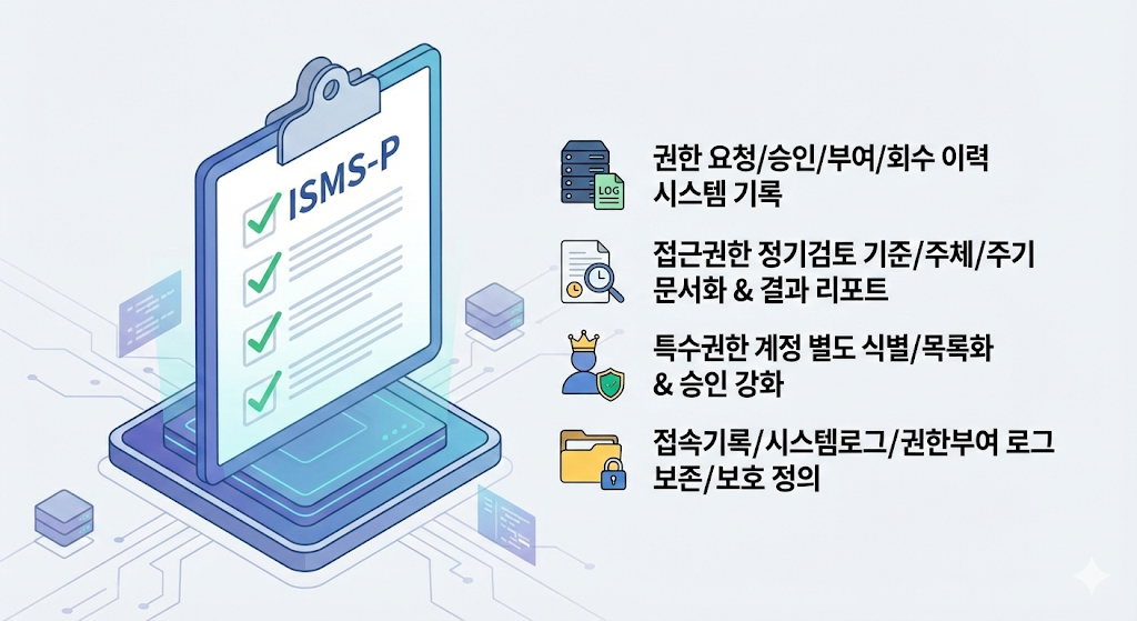 ISMS-P 권한관리에서 중요한 건 권한을 통제한다가 아니라, 권한관리·특권계정 통제가 실제로 운영되고 있다는 운영 증적을 꾸준히 남기는 것입니다. 즉 ISMS-P 2.5(인증 및 권한관리)가 요구하는 신청–승인–부여–회수–정기검토 흐름을 흔들리지 않게 고정하고, 특권계정은 2.5.5(특수 계정 및 권한관리) 취지에 맞게 별도 식별, 승인 강화, 기록 관리로 책임추적성을 확보해야 합니다. 여기에 2.9.4(로그 및 접속기록 관리)까지 제출 패키지 관점에서 연결해 정책 문서 + 이력 + 리포트 + 로그가 한 묶음으로 준비되면, ISMS-P 심사에서 방어력이 높은 형태로 정리할 수 있습니다.