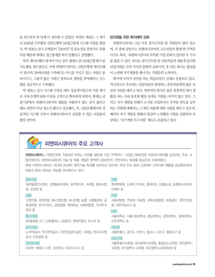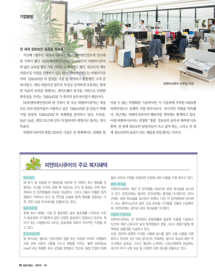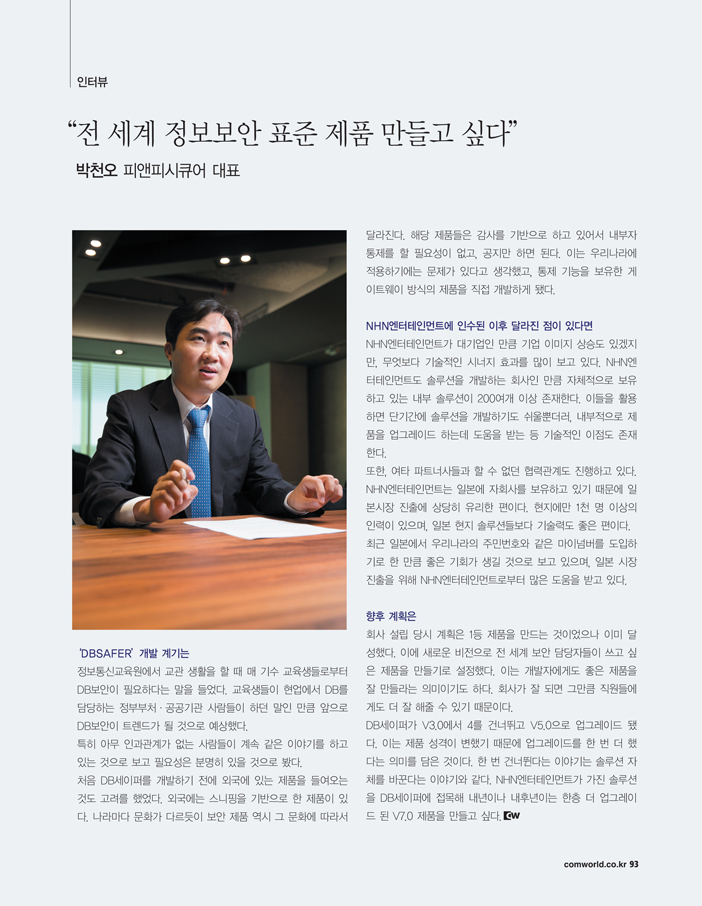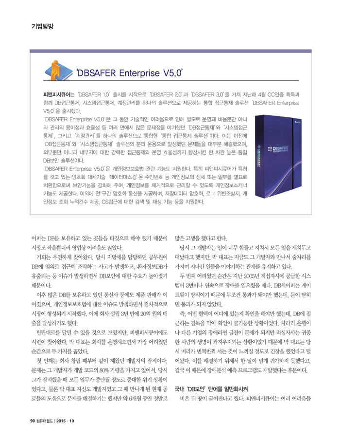 NEWS 컴퓨터월드 2015년 10월호 '기업탐방'에 소개된 (주)피앤피시큐어 PNPSECURE 05 10월 2015 • 1 min read ■ DB보안, 국내 1위 넘어 세계의 표준 노린다컴퓨터월드 2015년 10월호 '기업탐방' 특집에 (주)피앤피시큐어가 선정이 되어 지면에 소개되었습니다.