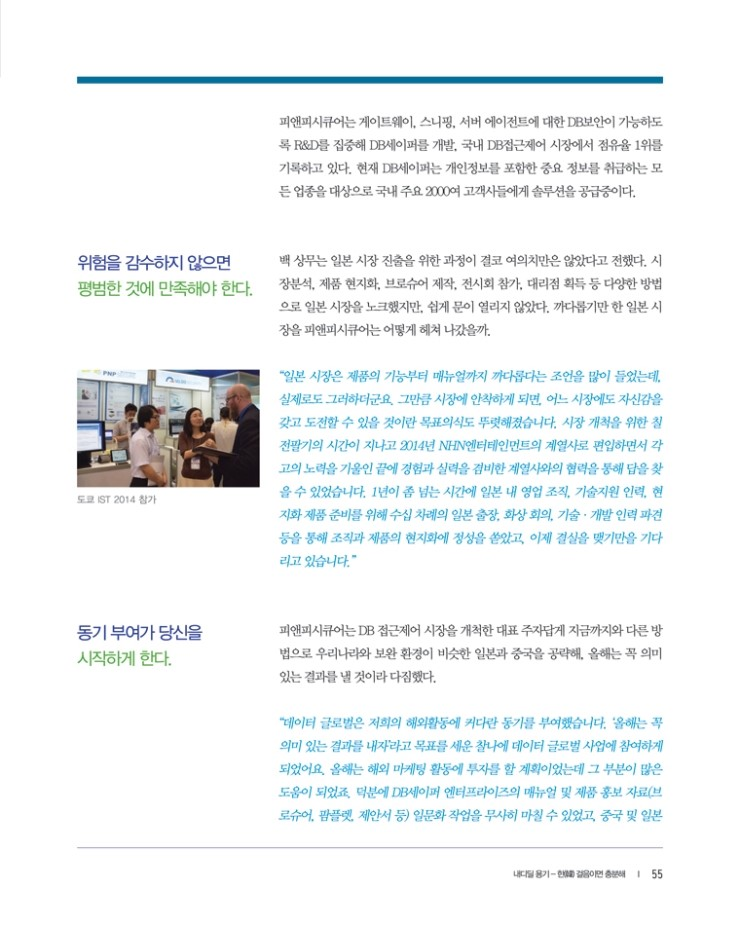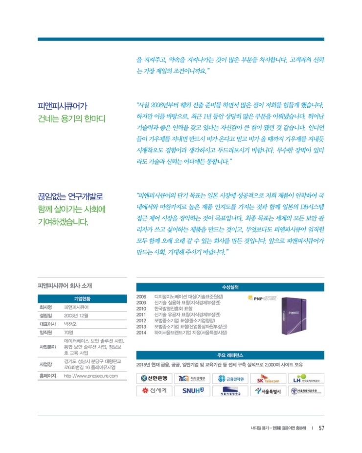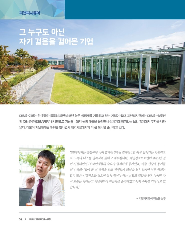 KODB(한국 DB진흥원)에서 발행된 데이터 기업 해외진출 사례집 '내디딜 용기'에 소개된 (주)피앤피시큐어