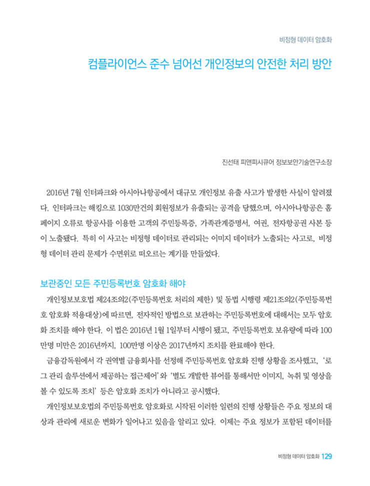 기고문은 최근 '개인정보보호법 시행령'과 '개인정보의 안정성 확보조치 기준'에서 의무로 규정된 '정보의 암호화'에 대해 필요성과 운영 및 구현방향 그리고 시장전망에 대한 내용으로 '진선태' 정보보안기술연구소장께서 작성해주셨습니다.