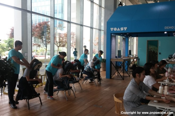 자녀와 함께 온 임직원은 그동안의 피로를 풀기 위해 '마사지' 프로그램 코너로 직행했습니다.