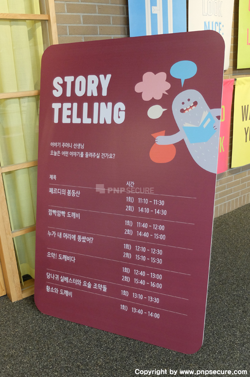 작은 인형극 공연을 연상케 하는 안내판과 진행 중인 'STORY TELLING' ↓