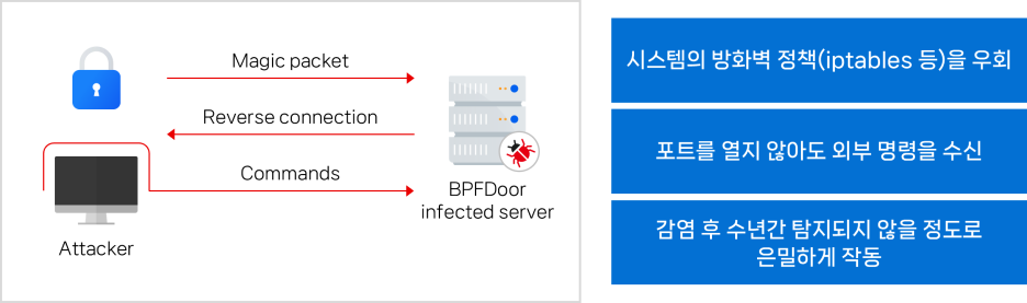 시스템의 방화벽 정책(iptables 등)을 우회하고, 포트를 열지 않아도 외부 명령을 수신할 수 있으며, 감염 후 수년간 탐지되지 않을 정도로 은밀하게 작동합니다. 이러한 특성으로 BPFDoor는 시스템 내에서 BPF 필터를 설정해 특정 트래픽만 선별 수신할 수 있으며 공격자는 이를 통해 매직 패킷으로 불리는 명령어를 전달해 악성코드를 활성화하고 데이터 유출을 시도합니다.