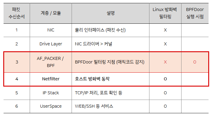 특히 BPFDoor와 같은 공격 도구는 고도화된 리눅스 기반 백도어 악성코드로, 해커는 방화벽을 우회하고 탐지를 회피해 시스템에 은밀히 침투합니다. 최근에는 소스코드가 공개로 새로운 변종이 발생하고 있으며 그와 더불어 다양한 공격 방식이 나타나고 있습니다.