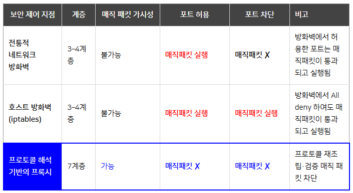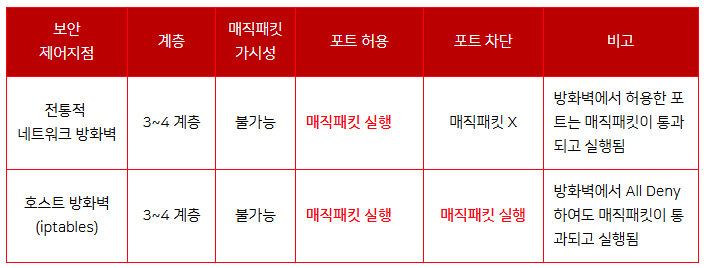 해당 패킷은 서버의 iptables 이전 단계인 Kernel 단에서 RAW Socket에 먼저 수신되어 매직패킷임이 감지되기 때문에 숨겨진 동작을 수행할 수 있습니다. 즉, 방화벽(iptables)에 도달하기 이전에 패킷에 숨겨진 동작을 수행할 수 있기 때문에 호스트 내부 방화벽도 무력화 하는 것입니다.