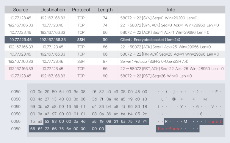 예를 들어 SSH(Secure Shell) 프로토콜은 “키교환 > 인증 > 암호화 통신” 순서를 가지고 payload 에는 문자열이 없어야 합니다. 하지만 SSH 포트를 이용한 BDFDoor 패킷에는 식별 가능한 문자열이 포함되어 있습니다.