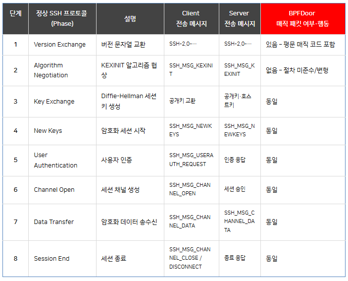 정상 SSH 프로토콜 흐름 vs SSH Port BPFDoor 매직 패킷 비교