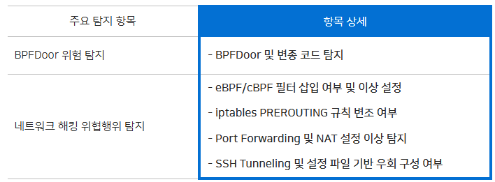 이러한 위협을 근본적으로 방어하기 위해서는 정상 행위를 위장한 내부 설정 조작 여부, 즉 커널 레벨의 BPF 필터 설정, iptables PREROUTING 체인 변조, 비인가 포트 포워딩, 암호화된 SSH 터널링 구성 등의 항목까지 종합적으로 점검해야 합니다. 이는 침투 이후 내부 장악, C2 연결, 데이터 유출 등의 고도화된 행위를 탐지하는 핵심 요소입니다.