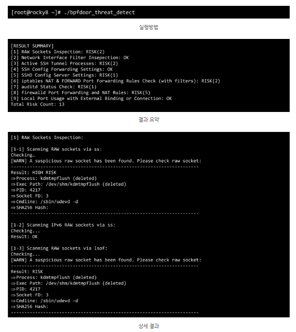 결과적으로, PNPSECURE Server Threat Detector는 악성코드 유무를 넘어 침해 징후와 시스템 설정 조작까지 통합적으로 분석하여, BPFDoor가 악용하는 모든 경로를 선제적으로 탐지하고 차단할 수 있는 기술적으로 완결된 서버 보안 대응 수단입니다.