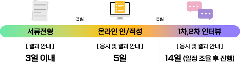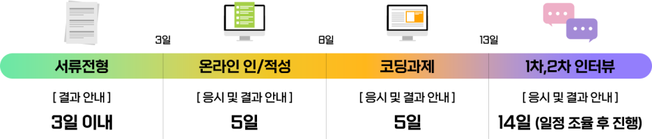 단계별로 결과 안내는 채용 공고에 적힌 기간을 준수하며, 1/2차 인터뷰 모두 지원자가 날짜를 선택하여 진행할 수 있습니다. 기약 없는 기다림이 아니라는 점에서 실제 합격자들의 만족도가 가장 높은 부분입니다. 또, 합격 여부와 별개로 인터뷰를 위해 시간을 내어주신 모든 지원자에게 감사한 마음을 담아 면접 수당을 제공하고 있습니다 : )