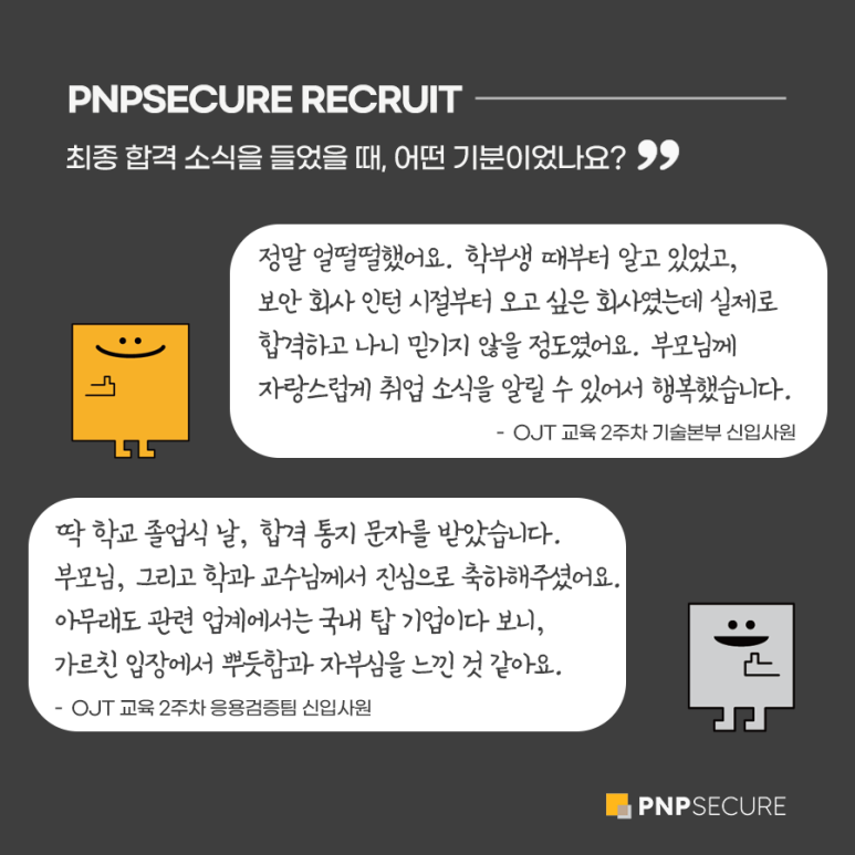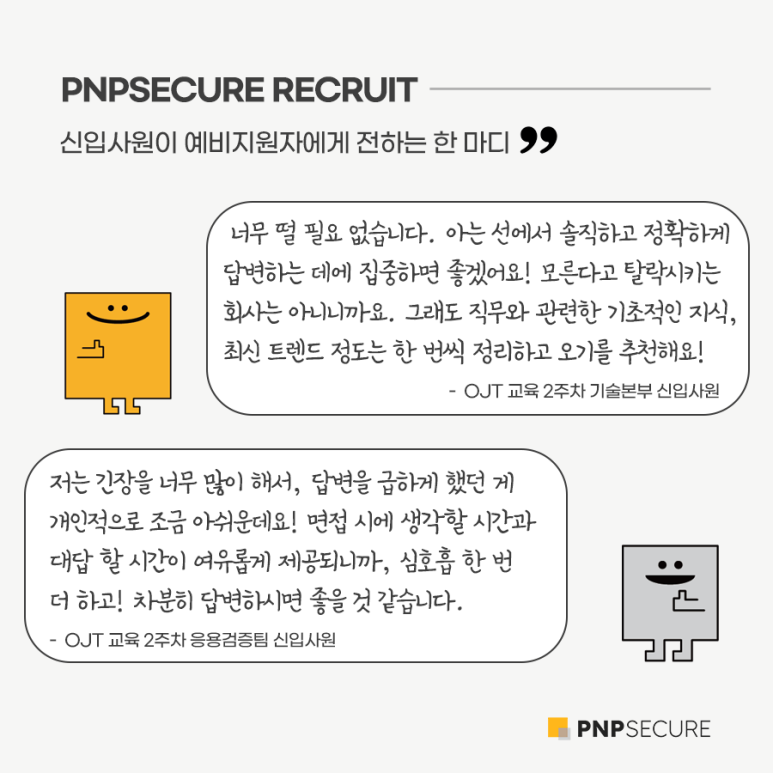 마지막으로, 이 모든 과정을 거쳐 OJT 교육과정을 수료 중인 신입사원 2인의 합격 소감과 함께 피앤피시큐어가 모든 예비 지원자의 최종 합격을 응원하겠습니다 💪💪