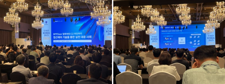 특히 'BPFDoor 공격 침투부터 C2 차단까지 : 접근제어 기술을 통한 실전 대응 사례'를 주제로 진행된 피앤피시큐어 기술본부장의 세션에 200여 명의 참관객 분들께서 자리 해주셨습니다.