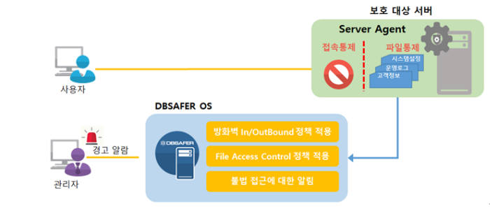 디비세이퍼 OS는 중앙관리서버에 설치하는 서버 에이전트다. 호스트 방화벽, 파일 접근 통제정책을 배포·관리한다. 통합관리솔루션으로 사용자 등록을 한 번에 관리 가능하며 인사 정보도 연동한다. 수집된 로그를 활용해 사용자에 대한 불법 접근 행위를 추적한다. 사용자 OS를 고려해 AIX, HP-UX, SunOS, 리눅스, 윈도 등 다양한 버전을 지원한다.