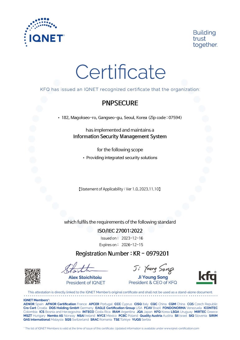 피앤피시큐어가 국제 표준 정보보호 경영시스템 ISO/IEC 27001:2022 인증을 획득했습니다.