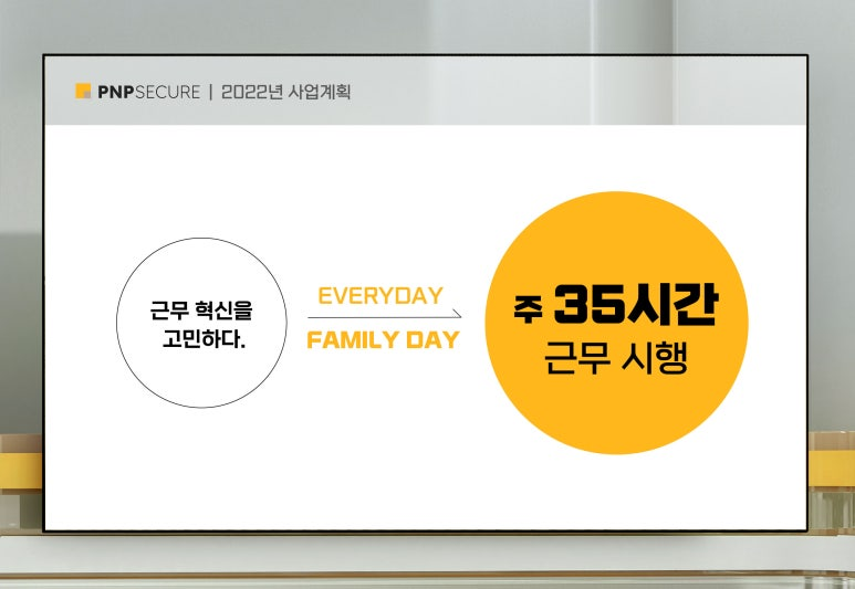 피앤피시큐어는 지난해까지 매월 첫째 주와 마지막 주 금요일에 1시간 일찍 퇴근하는 ‘패밀리 데이’를 시행한 바 있다. 더 나아가 2022년에는 근무 혁신을 통해 일과 생활의 균형이 실현되는 ‘워라밸(work-life balance)’이 보장된 근무환경을 만들고자, 매일 한 시간 조기 퇴근해 하루 7시간씩 주 35시간 근무하는 제도인 ‘(가칭) 에브리데이 패밀리데이(Everyday Family Day)’를 시행하기로 선언했다.