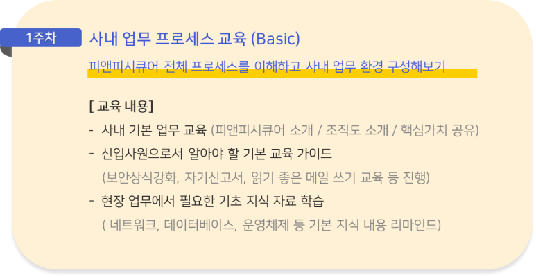 1주차 | - 사내 기본 업무 교육 (피앤피시큐어 소개 및 핵심가치, 방향성 제시) - 신입사원으로서 알아야 할 기본 교육 ( 직장 생활 가이드, 읽기 좋은 메일 쓰기 교육 등) - 현장 업무에서 필요한 기초 지식 자료 학습 ( 네트워크, 운영체제, 데이터베이스 등) |