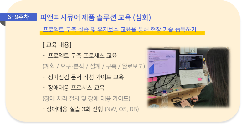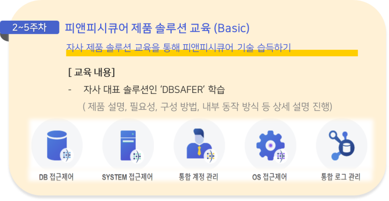 2주차부터 5주차까지 약 3주 동안은 '피앤피시큐어의 제품에 대해서 기본적인 개념, 동작방법' 등을 교육합니다!