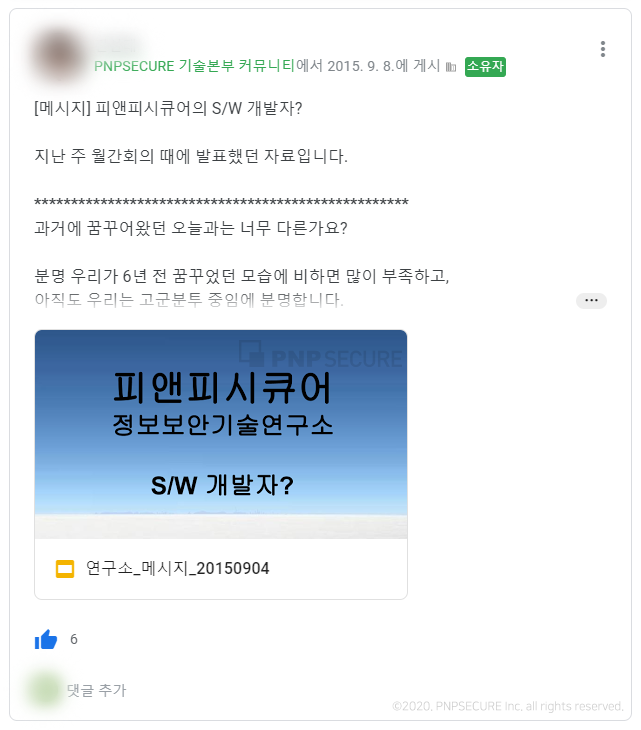 지금 이 시간에도 진행되고 있는 업무 문화와 환경 개선, 정보의 투명성 확보와 공유 및 활용성 극대화, 사내 보안 감사 활동을 통한 보안 사고 예방, 지속적인 업무 프로세스 간소화 등 개선 노력, 자체 솔루션 PNP_SUPPORT를 활용한 원격 기술지원 서비스 제공 등을 포함하여 더욱 똑똑하고 편리한 업무환경과 신속한 기술 서비스 제공을 위한 활동을 게을리하지 않을 것입니다.