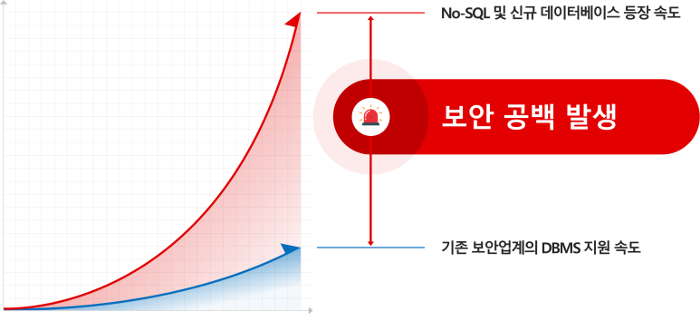 그러나 No-SQL과 같은 신규 데이터베이스의 등장 속도가 급격하게 증가함에 따라 기존의 RDBMS 보안 방식은 프로토콜 분석 방식만으로는 보안 체계를 마련할 수 없게 되었으며 기업의 보안 위협 또한 급증하고 있는 상황입니다. 이에, RDBMS를 넘어 데이터 분석 플랫폼 전반에 활용이 가능한 접근제어 솔루션에 대한 니즈가 높아지고 있습니다.