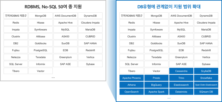 RDBMS와 범용 No-SQL에 대해 강력한 보안 통제 기능을 제공하는 DB Proxy 엔진, 신규 No-SQL에 대한 신속한 대응에 최적화된 No-SQL Proxy 엔진, 그리고 모든 RDBMS·No-SQL에 대해 빠른 적용이 가능한 DB 클라이언트 툴 연동 엔진. 총 3가지의 기술을 하이브리드 형태로 결합해 제공합니다.