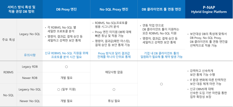 P-NAP은 피앤피시큐어의 하이브리드 기술 체제의 데이터베이스 대응 플랫폼으로 3가지 엔진을 제공합니다.