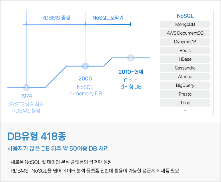 최근 데이터베이스 환경은 기존의 관계형 데이터베이스 관리 시스템(RDBMS)에서 NoSQL로 빠르게 전환되고 있습니다. 이는 데이터의 다양성과 양이 급증하면서 유연성과 확장성이 뛰어난 NoSQL 데이터베이스가 각광받고 있기 때문입니다. 그러나 NoSQL의 도입으로 인해 다양한 데이터베이스가 빠르게 출시되면서 기존의 방식으로는 신속한 대응이 어려워졌습니다.