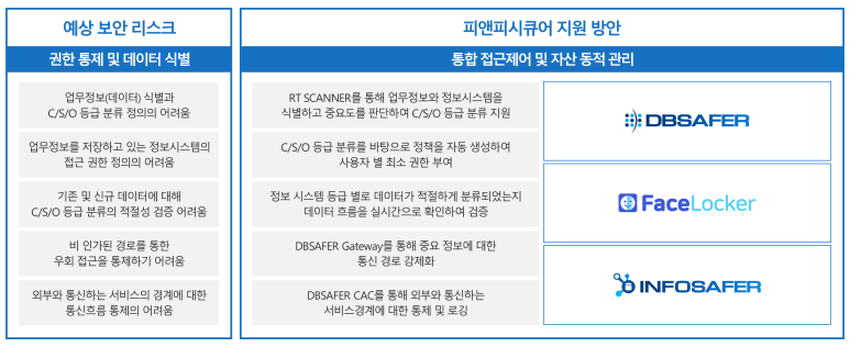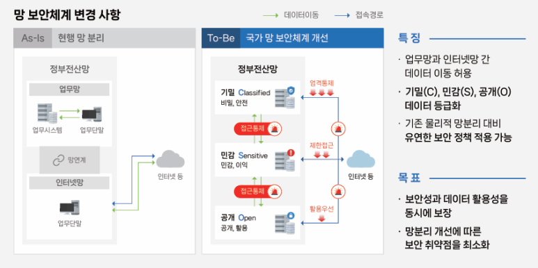 기존의 망분리 체계와 달리 업무망과 인터넷망 간 데이터 이동이 가능해지고, 데이터 등급에 따라 다양한 업무 시스템 간의 이동 또한 자유로워졌으나 이는 접속 경로가 다양해지고 데이터의 이동이나 사용 권한에 대한 통제가 미흡한 경우 주요 데이터가 유출될 가능성 또한 높아졌음을 의미합니다. 이에 보다 강화된 접근제어 기술의 도입이 필요합니다.