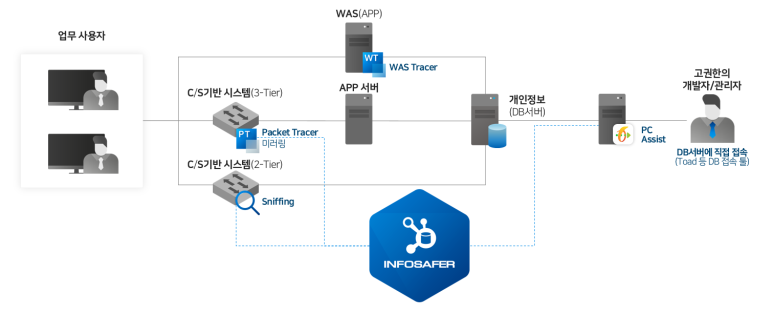 개인정보를 대량으로 조회하는 개발자와 관리자들에 의한 2티어 접속과 일반 사용자들이 애플리케이션에서 조회하는 3티어 접속 모두를 하나의 솔루션에서 기록하는 것이 관리 편의성이나 보안성 측면에서 유리하다. 인포세이퍼는 2티어 로그와 3티어 로그를 단일 솔루션에 저장해 사용자의 이상행위를 정확하게 파악하고 대응할 수 있다.