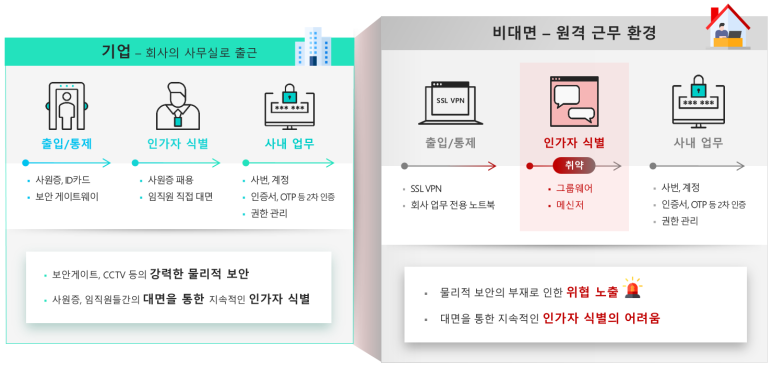 보안 컴플라이언스가 물리적 시스템 보안에 중점을 뒀다면 코로나19의 확산에 따라 비대면·재택근무를 실시하고 있는 기업들은 현재의 물리적 시스템 보안만으로는 기업의 중요 업무시스템에 언제든지 허가되지 않은 외부 사용자가 접근할 수 있다고 판단하고 있다. 이에 대한 보호조치로 실시간 생체인증을 통해 인가된 사용자만 업무시스템에 접근하도록 기술적 보호조치를 강화하고 있다.